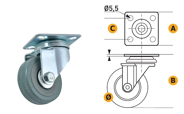 Disponibile in diversi diametri, è ideale per carrelli da officina, mobili da laboratorio, scaffalature, espositori e attrezzature professionali. Il design compatto e funzionale la rende adatta anche per usi domestici, dove è richiesta una ruota resistente ma silenziosa.