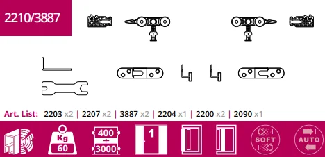 Il kit comprende tutti i componenti fondamentali per l’installazione: carrelli di scorrimento, guida superiore, fermi fine-corsa, staffe di fissaggio e accessori di montaggio, garantendo un sistema pronto all’uso e compatibile con la maggior parte delle ante in legno o pannello. La struttura è progettata per assicurare un movimento stabile e preciso, riducendo vibrazioni e rumori.